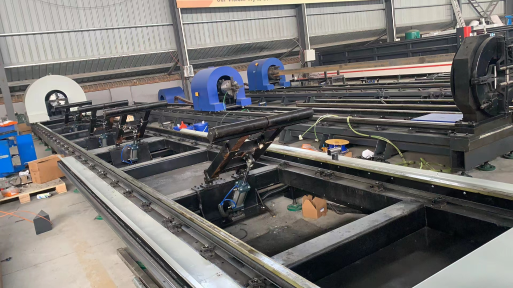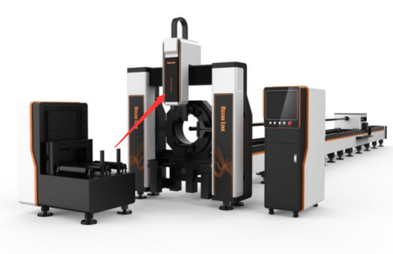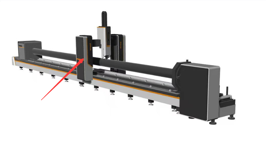 2.可移動的龍門架:該五軸切管機的龍門架可以順著導軌移動到后卡盤處切割,目前市面上的龍門架基本上是固定的,無法移動,只能在卡盤前面切割,這樣導致尾料就會剩余比較多,比較浪費材料,也不適合長料切割,可移動的龍門架是我們機器的獨特優勢,沒有這個功能的情況下, 尾料長度在50cm左右,切的越多,客戶浪費原材料就越多,有了龍門架跨境功能,尾料能控制在4cm,為客戶極大的節省了原材料。