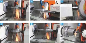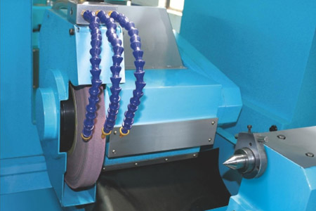 當工件的外徑與其肩頭研磨需要一次完成時,工件由二頂心支撐且將砂輪改裝到砂輪頭右邊并旋轉(zhuǎn)一角度即可研磨。