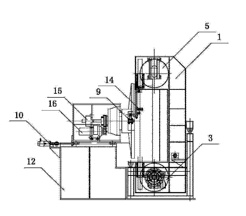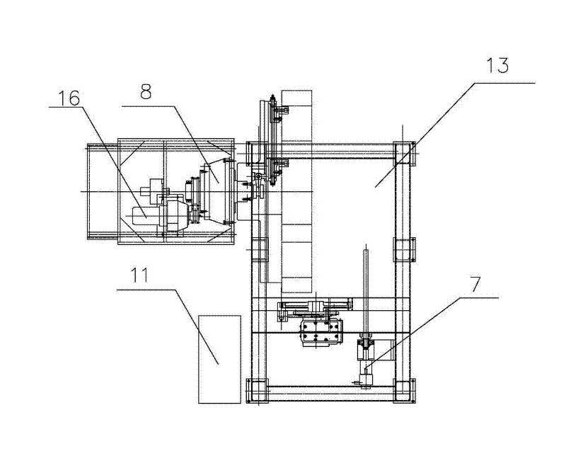 圖中1.鋸架,2.鋸帶傳動(dòng)系統(tǒng),3.主動(dòng)輪,4.鋸帶張緊裝置,5.張緊輪,6.鋸帶對(duì)中導(dǎo)向裝置,7.鋸架進(jìn)給裝置,8.圓環(huán)裝夾旋轉(zhuǎn)裝置,9.杠桿式圓環(huán)張緊裝置,10.圓環(huán)移動(dòng)裝置,11.電氣系統(tǒng),12.液壓系統(tǒng),13.冷卻系統(tǒng),14.張緊柱,15.液壓旋轉(zhuǎn)油缸,16.旋轉(zhuǎn)電機(jī)。